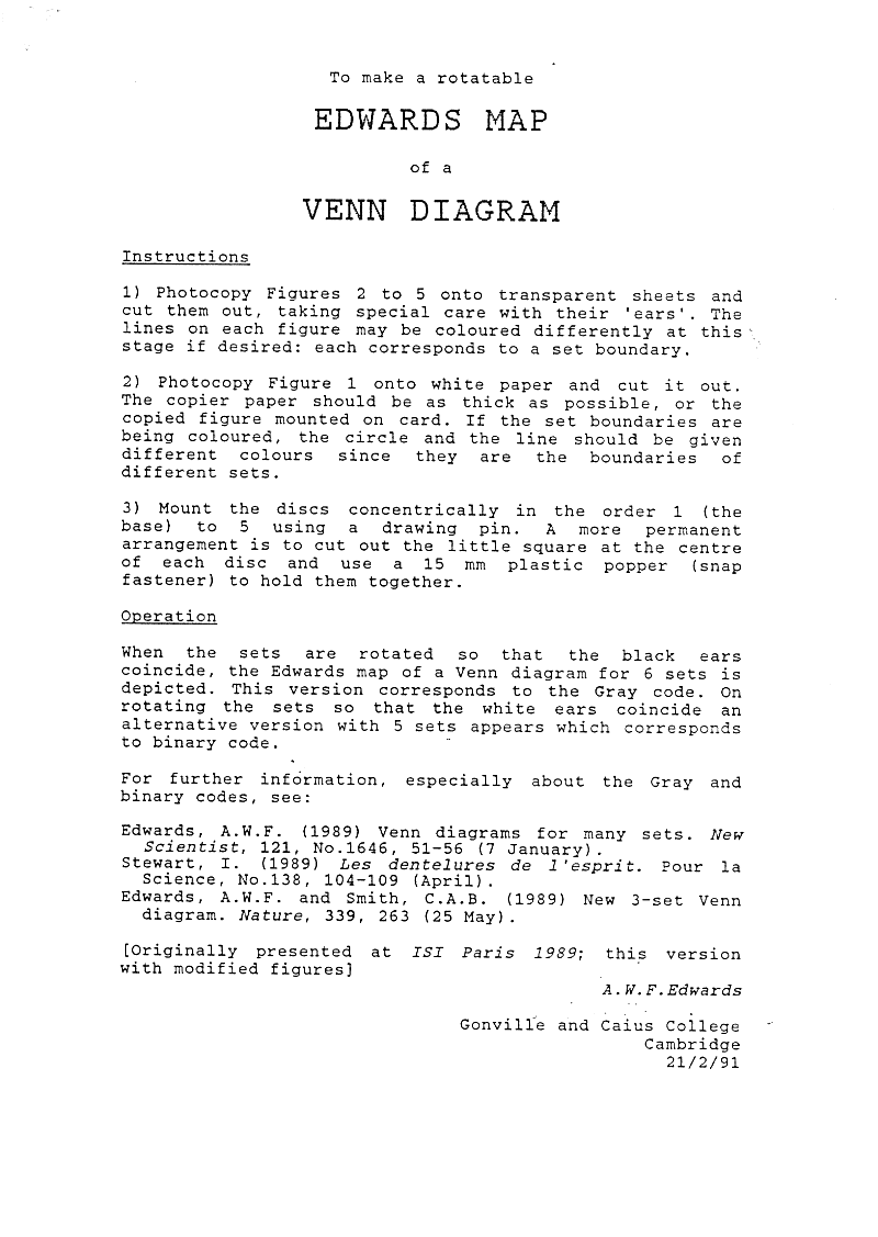 Edwards [Ed92] produced templates for making a rotatable Venn diagram; templates which we have scanned: page 1, page 2, page 3, page 4.