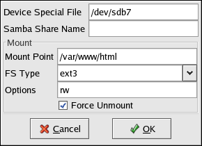 Before the service is added to the cluster configuration, ensure that the Apache HTTP Server directories are not mounted. Then, on one member, invoke the Cluster Configuration Tool to add the service, as follows. This example assumes a failover domain named httpd-domain was created for this service. Figure 7-1 shows the <device> settings for configuring the shared storage and mount point where HTML files and CGI scripts will be stored.