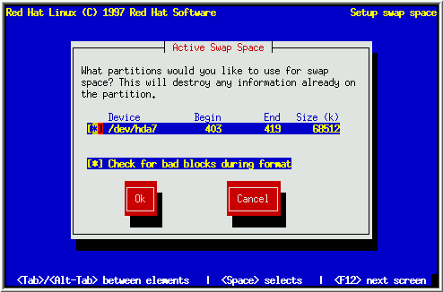 After you've created partitions for Red Hat Linux, the installation program looks for swap partitions (see Figure 27). If it finds any, it asks whether you want to initialize them. Select the partition(s) you wish to initialize as swap space using [Space]; if you wish to check the partitions for bad blocks, make sure the Check for bad blocks during format box is checked. Choose OK, and press [Space].