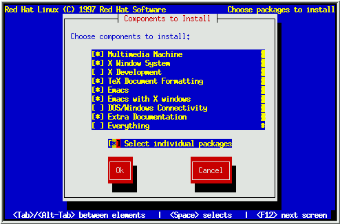 After selecting the components you wish to install, you may select or deselect individual packages. The installation program presents a list of the package groups available; select a group to examine and press [Enter]. The installation program presents a list of the packages in that group, which you may select or deselect using [Space] (see Figure 30). You may view a detailed description of a package by pressing [F1]. When you are finished selecting individual packages, press OK in the Select Group dialog box.