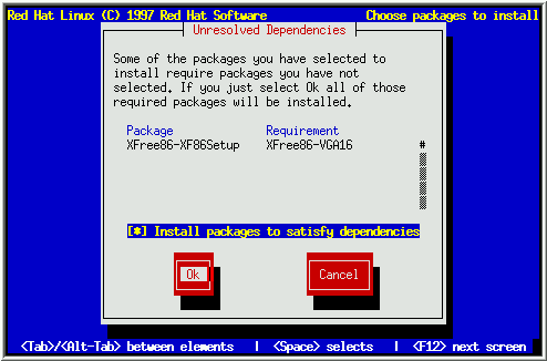 After you have finished selecting packages to install, the installation program checks the list of selected packages for dependencies. If any package requires another package which you have not selected to install, the program presents a list of these unresolved dependencies and gives you the opportunity to resolve them (see Figure 31). If you simply press OK, the program will resolve them automatically by adding all required packages to the list of selected packages.